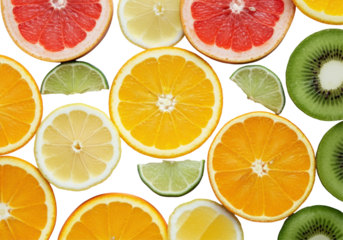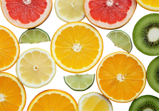 Citrus fruits, citrus slices and leaves on a white or transparent background.