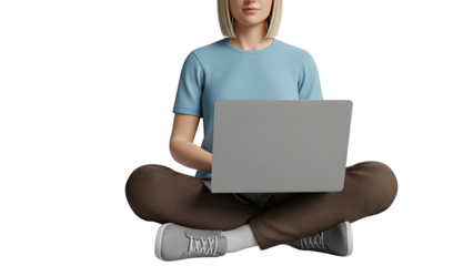 Young woman in yellow shirt browsing digital tablet, long brown hair flowing, transparent backdrop