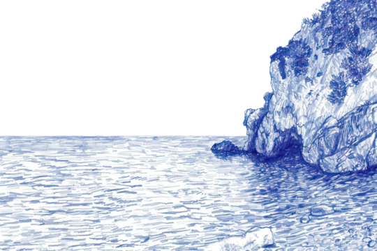 Coastal cliffs meet the calm ocean waters at dusk isolated on transparent background