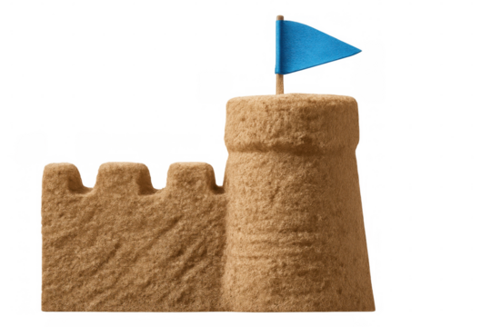 Sandcastle with blue flag, representing summer fun, beach vacation, childhood play, and creative building