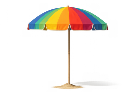 Colorful beach parasol providing summer shade on a tropical vacation, resting on sand, transparent background