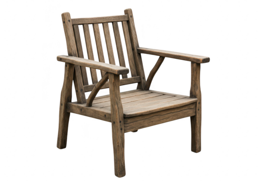 A rustic wooden armchair for outdoor seating, isolated on a transparent background