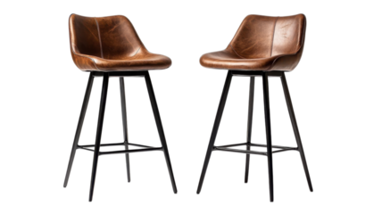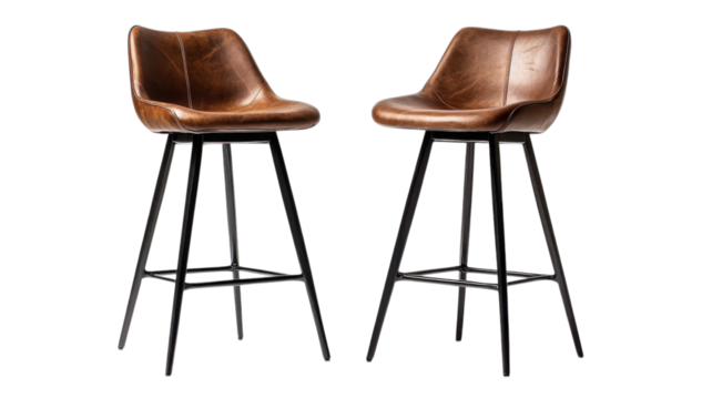 Sleek contemporary bar stools with brown leather seats and sturdy black metal frames, perfect for kitchens