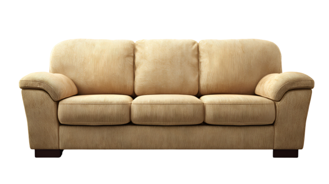 Comfortable beige sofa with three seats and brown feet