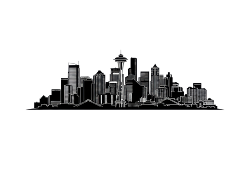 meticulously detailed black vector silhouette of the iconic seattle skyline with 'SEATTLE' text, on a transparent background with copy space. concept of urban identity branding