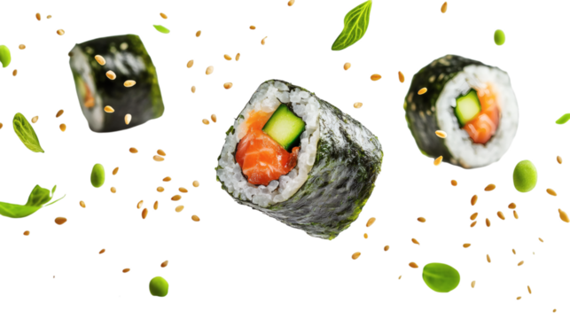 Sushi roll Maki with salmon, avocado, cucumber and rice wrapped in seaweed, isolated on white transparent background, concept of Japanese cuisine