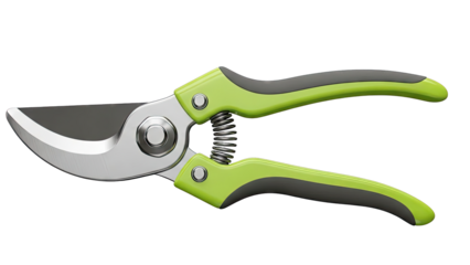 Green-handled metal secateurs gleaming, positioned for precise pruning and garden trimming against transparent backdrop