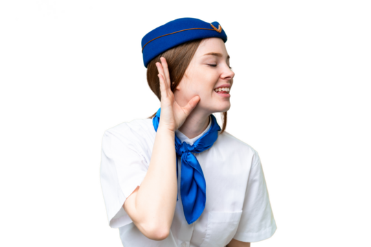 Airplane stewardess over isolated chroma key background listening to something by putting hand on the ear