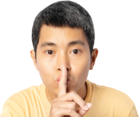 A woman in a business suit and glasses gestures for silence, isolated on a transparent background