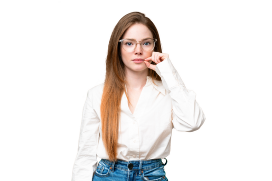 Young caucasian woman over isolated chroma key background showing a sign of silence gesture putting finger in mouth