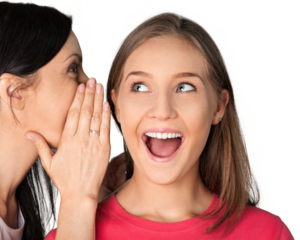 Attractive and cute young brunette model share information about sale and discount. Gossip rumor concept isolated on red vivid background