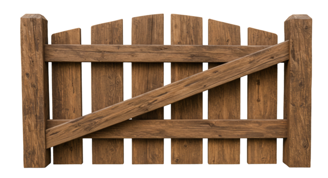 A wooden fence section isolated on a transparent background. Ideal for construction, gardening, rural, and decorative design projects.