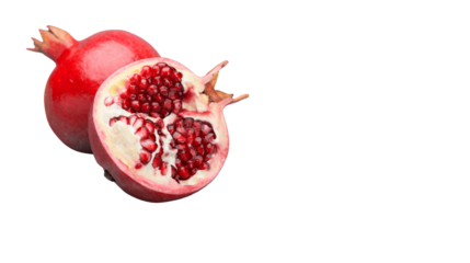 Fresh ripe pomegranate fruit with open section showing juicy red seeds, symbol of health, nutrition, and freshness, isolated on transparent background, PNG.