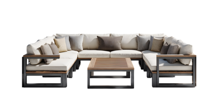 Modern outdoor wicker sectional sofa with a gas fire pit table isolated on a transparent background