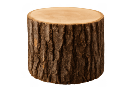 Tree stump on transparent background. Round log section with natural wood grain, bark, and growth rings. Organic element