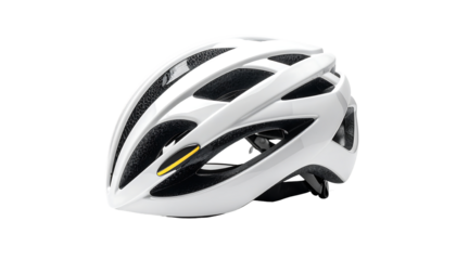 White cycling helmet with extensive ventilation, sleek aerodynamic design, and subtle yellow accents