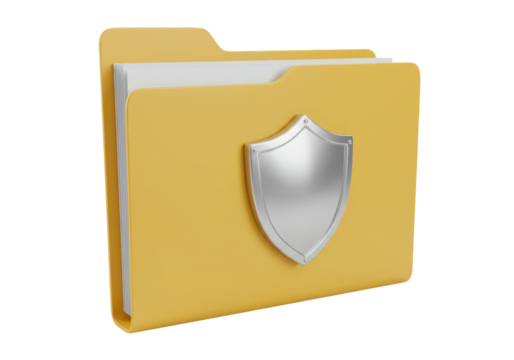 Isolated yellow folder with silver shield icon representing data protection and secure confidential documents digital safety and privacy concept