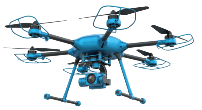 Isolated blue quadcopter drone with camera and propeller guards for aerial photography