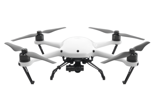 Sleek white drone with camera and four propellers against a for aerial photography on transparent background