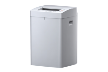 White rectangular office paper shredder.  Compact, modern design with a clear feed slot, control panel, and waste bin.  Handle for easy transport