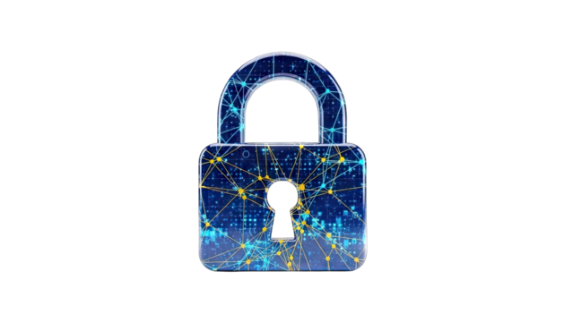 Digital Padlock Icon Symbolizing Cybersecurity Data Protection with Blue and Yellow Circuitry on Transparent Background