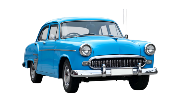 Front view of a classic bright blue sedan with chrome accents against a transparent background