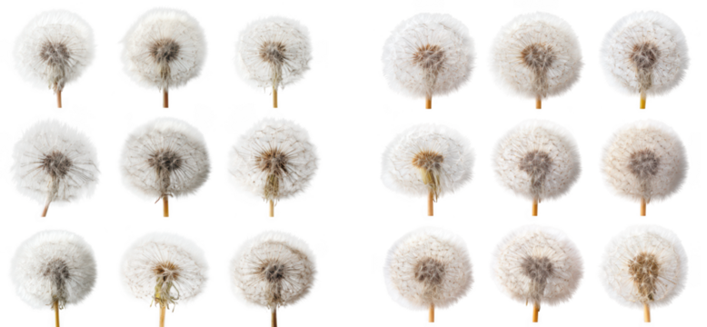 Isolated Dandelion seed heads with seeds dispersing in air in Spring, delicate lightness