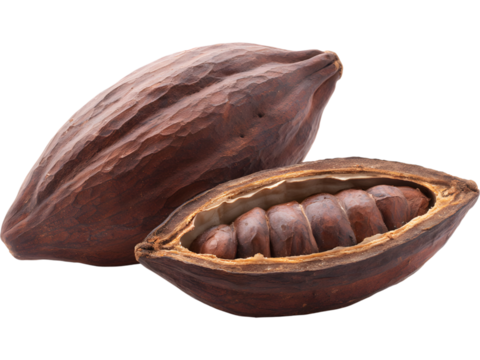 Realistic cocoa bean pod isolated on transparent background, symbolizing chocolate production and tropical agriculture.