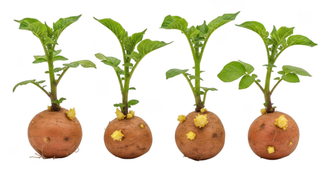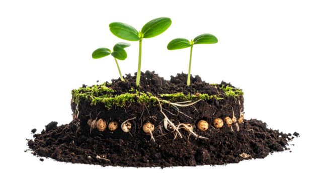 Hands holding soil with a small plant growing out on a black background isolated on transparent background