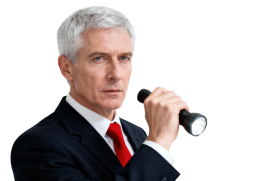 Serious Businessman with Flashlight in Studio on White