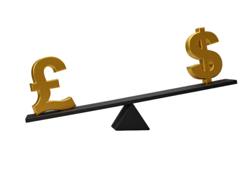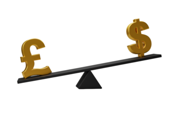 3D Illustration Golden Pound And Dollar Symbols On Balancing Seesaw Isolated