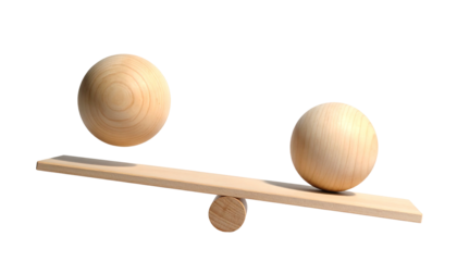 Two wood balls balanced on a seesaw, tilting to the right, against a black background