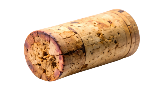 Close-up of a cylindrical cork, showing varied textures, with a black background