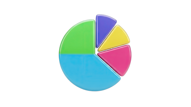 Vibrant 3D pie chart with four colorful sections isolated on transparent background.