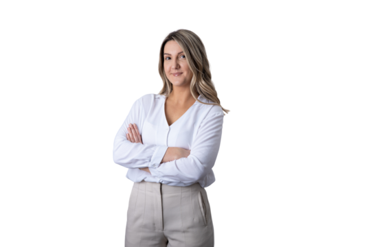 Confident woman with curly hair wearing a black turtleneck sweater, posing against a neutral background.