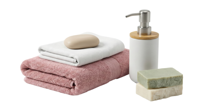 set of bathroom essentials with towels soap and dispensers isolated on black background