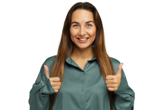Cheerful woman giving thumbs up in casual outfit and smiling with long hair against white background