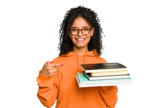 Young student woman holding a pile of books isolated person pointing by hand to a shirt copy space, proud and confident