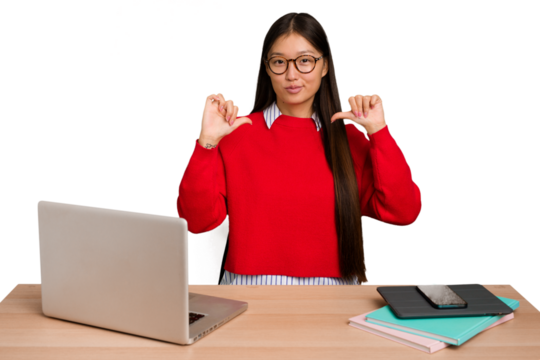 Young Indian woman studying with laptop feels proud and self confident, example to follow.
