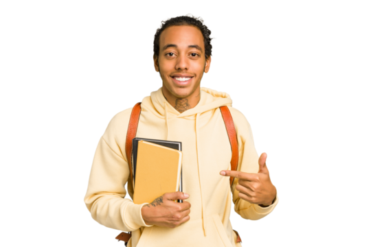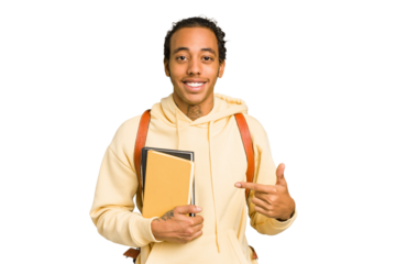 Young african american student man holding a book person pointing by hand to a shirt copy space, proud and confident