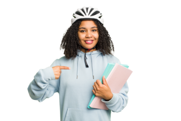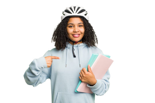 Young student asian woman holding a takeaway food isolated person pointing by hand to a shirt copy space, proud and confident
