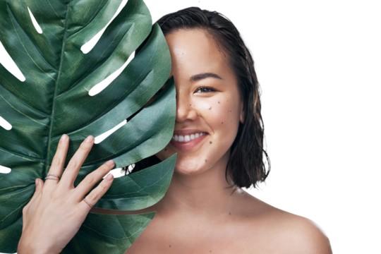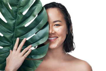 Woman, beauty and smile or leaf, portrait and wellness or isolated on transparent png background. Asian female person, plant and organic skincare or self care, dermatology and natural treatment