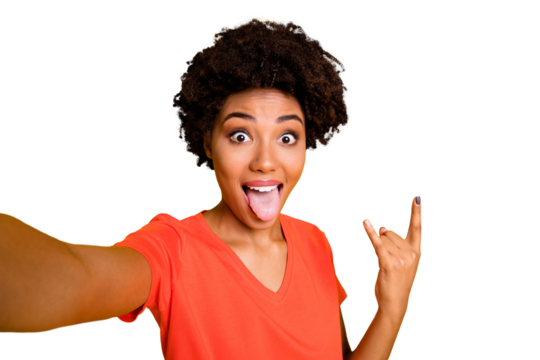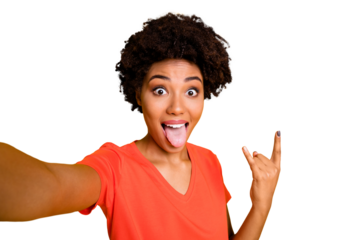 Young woman with funky mood making v-sign and selfie on the front camera of smartphone, playful and happy isolated on red background