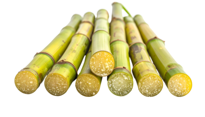 Close-up of several sugar canes, sliced and whole, arranged in a semi-circle against a solid black background