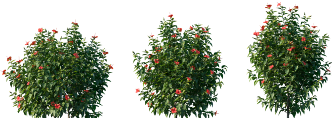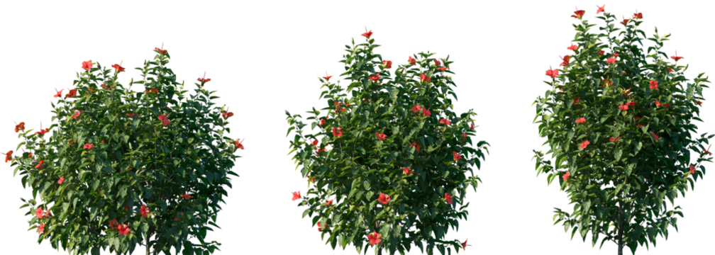 Set of Hibiscus rosa sinensis (Chinese hibiscus, China rose, Hawaiian hibiscus, rose mallow) blossoming frontal street shrubs isolated png on a transparent background perfectly cutout