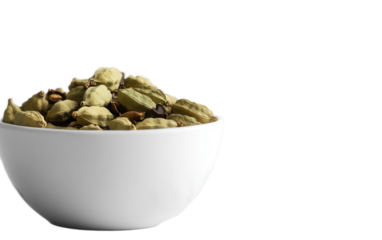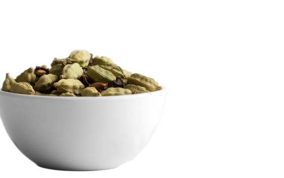 Cardamom pods in white bowl on white background,png