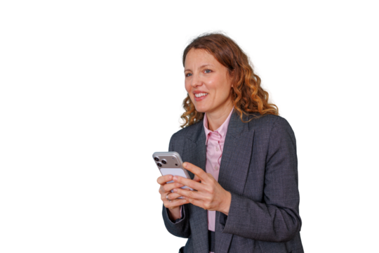 Businesswoman using smartphone, connecting and communicating, sending message, transparent background
