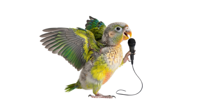 Funny Senegal parrot singing into a microphone isolated PNG with Transparent Background
