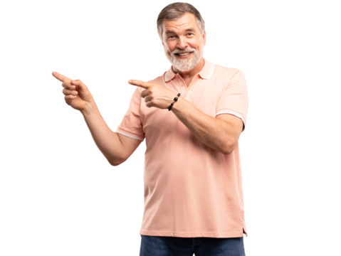 Happy mature business man entrepreneur, smiling older professional manager, confident businessman presenting ads advertising product or service isolated on transparent background.