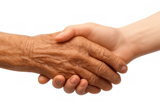 Multigenerational handshake, young professional greeting senior with warmth and respect against neutral backdrop